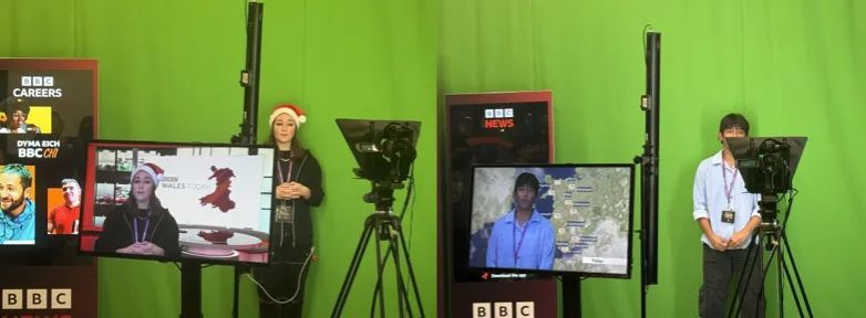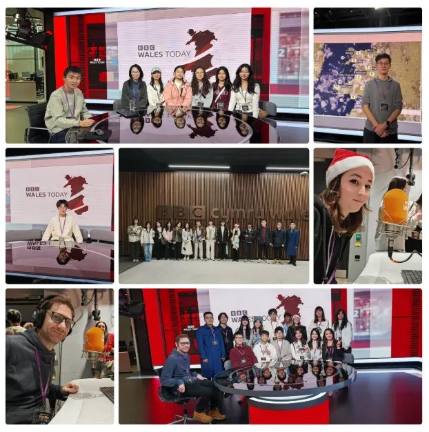 A “History Wall” in the atrium displayed archives and vintage equipment dating back to BBC’s founding in 1922, narrating BBC Wales’ enduring journalistic commitment since 1923. The visit peaked with immersive experiences: students sat at news anchor’s desk for mock live broadcasts and stood before green screens to present weather forecasts, gaining firsthand insight into the teamwork behind the screen.